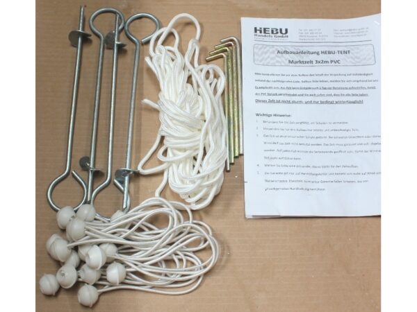 Im Lieferumfange ist eine deutsche Aufbauanleitung und Teileliste enthalten. Das Zelt wird inkl. Bodenbefestigungsset und Seilen ausgeliefert.