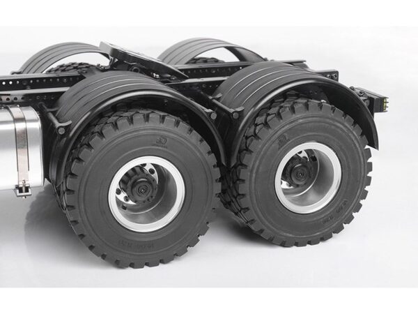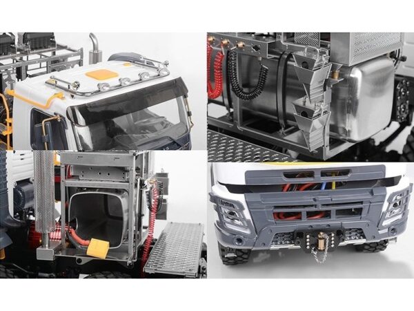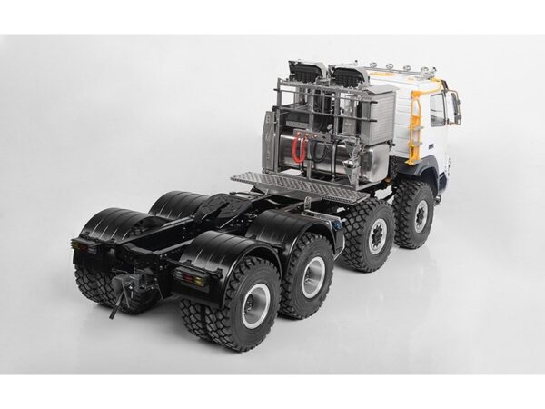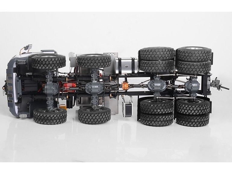 Dieser grosse Truck im Massstab 1:14 verfügt über einen 8×8 Antrieb. Der Antriebsstrang ist komplett aus Stahl und endet in Voll-Aluminium Achsgehäusen. Schon das Leergewicht von 8kg spricht für eine robuste Bauweise.
