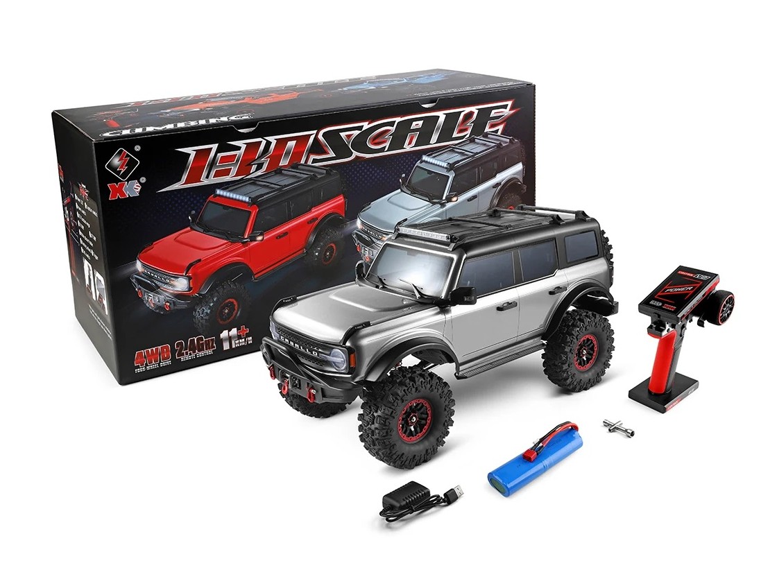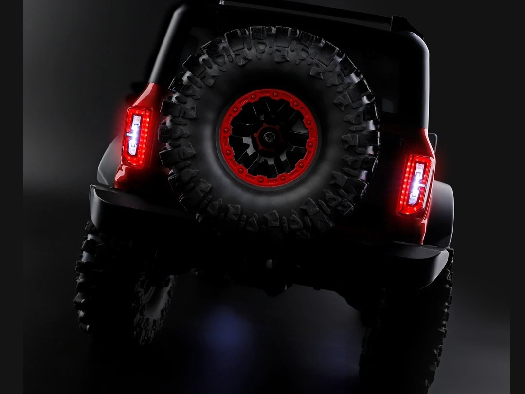 Die Scale-Karosserie ist mit einer funktionsfähigen LED-Lichtanlage ausgestattet, die unter anderem Lichtbalken, Suchscheinwerfer, Rückfahrlicht, Bremslicht und Blinker umfasst. Eine elektrische Seilwinde mit Stahlseil wird per Fernsteuerung gesteuert. Zusätzlich lassen sich die Differentiale individuell sperren oder entsperren – für maximale Anpassung an schwieriges Gelände.