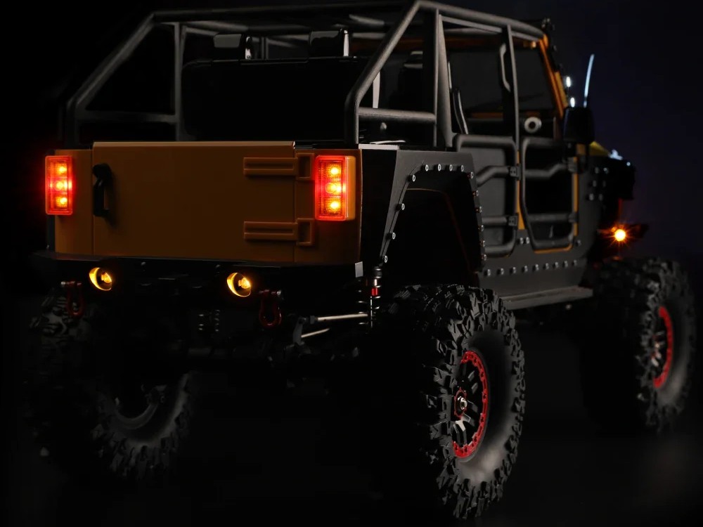 Die Scale-Karosserie ist mit einer funktionsfähigen LED-Lichtanlage ausgestattet, die unter anderem Lichtbalken, Suchscheinwerfer, Rückfahrlicht, Bremslicht und Blinker umfasst. Eine elektrische Seilwinde mit Stahlseil wird per Fernsteuerung gesteuert. Zusätzlich lassen sich die Differentiale individuell sperren oder entsperren – für maximale Anpassung an schwieriges Gelände.